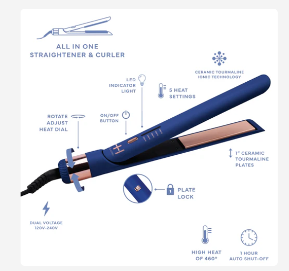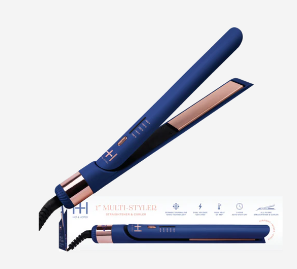 Introducing the ultimate styling tool for any hair type, Hot & Hotter's Multi-Styler 1 Inch Blue. With 5 heat settings up to 460°, ceramic tourmaline ionic technology, and a rapid heating time of 1 minute, this versatile hair straightener and curling iron provides a frizz-free and polished finish. Take it with you on your travels, thanks to its universal dual voltage range. Upgrade your styling game with this premier multi-styler!