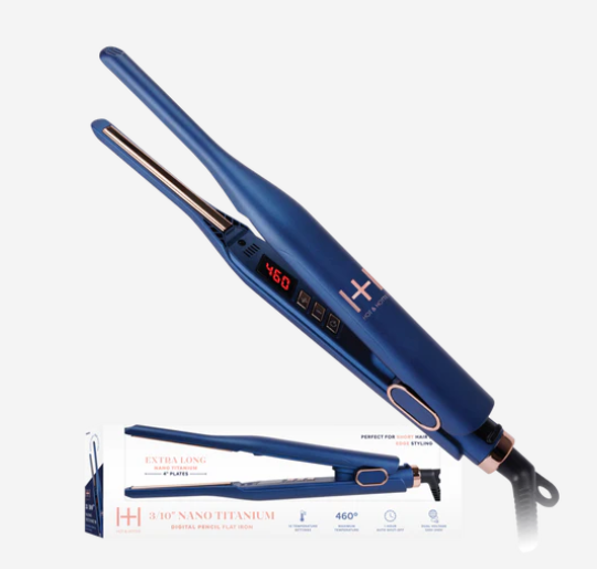 Digital Pencil Flat Iron in a striking blue! This isn't just any flat iron; it's the high-end marvel that every fashionista needs in their toolkit. With its ultra-thin 3/10" nano titanium 3D floating plates, it’s perfect for precision work on short hair and those tricky edges. The rose gold titanium plates are not just eye candy—they're designed to resist chemical reactions from your favorite styling products, ensuring longevity and performance.